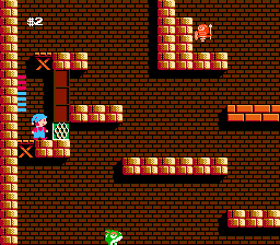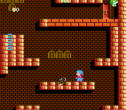 When you beat the well boss, your bubble will become bigger and more powerful, plus you'll get the hammer, letting you enter through certain parts of the castle wall. To get out of the well, either climb back out all the way, or kill an eye octopus thing.. that'll turn into a red balloon, and if you grab it, it'll warp you out. Once outside, go left and back down to the ground floor of the castle and enter the wall on the second ledge to find a shop where you get the saw, letting you enter the dark (barred) windows. While you're down on the first floor, you'll probably want to re-enter the first room just to kill bad guys and get some hearts to fill up your life meter. Now go back to the second floor (through where the first boss was). Enter the dark window on the right. There's the next boss for you! Beat him like you've been doing, then you're up on the 3rd level of the castle.
